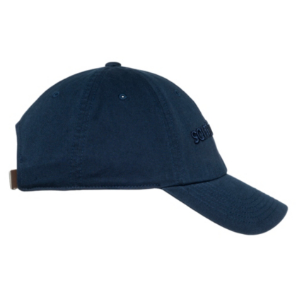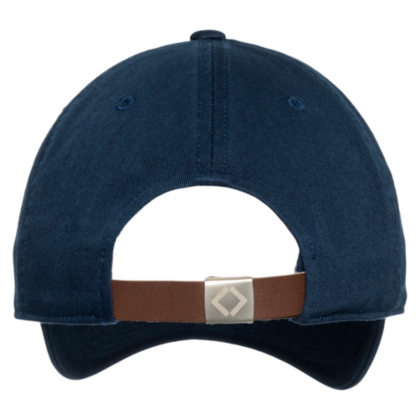Get your dad vibes on. This navy dad cap features a leather back strap with a metal etched slide buckle closure.