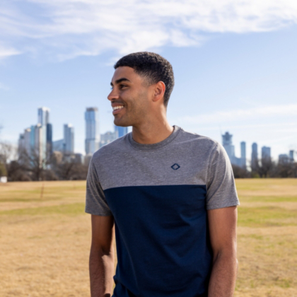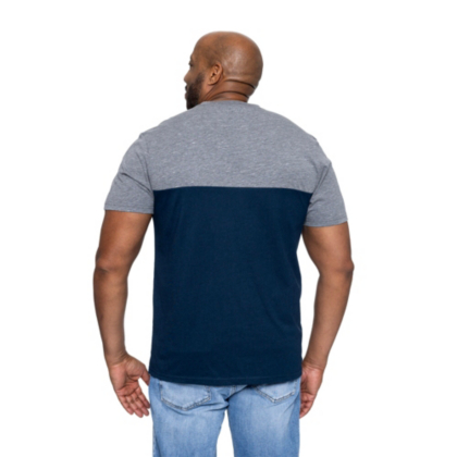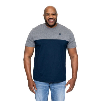 This men's heathered tee features navy color blocking and brings a laid back casual look.